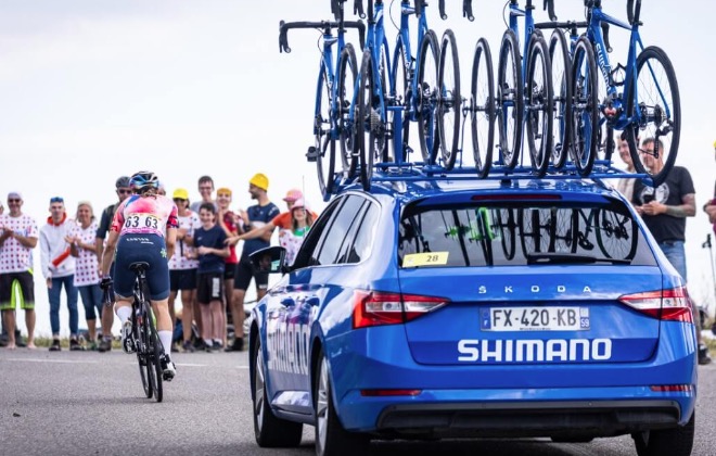 Cada corredor tiene sus manías, sus especificaciones, sus preferencias… pero todos llevan 5 bicicletas. “Ahora mismo llevamos cada etapa tres bicis por ciclista, la que lleva el corredor en la etapa y una bici de repuesto en cada coche. También hay dos bicis de contrarreloj cada uno. En total son cinco bicicletas por corredor”. ¿Todas son iguales? “hay tres corredores que están probando un prototipo de una bicicleta más aerodinámica, la FCR, que son Sam Bennett, Felix Gall y Oliver Naesen”.