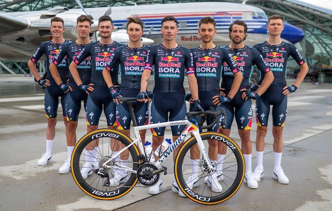 1.- Como ya adelantábamos a principios de año, Red Bull se ha unido a Bora y Hansgrohe como patrocinadores principales, lo cual significa un cambio de nombre, pero también otros muchos cambios estéticos. En palabras del CEO Ralph Denk, “tenemos un plan claro para convertirnos en la marca más atractiva del ciclismo. Quiero encontrar ciclistas icónicos y el desarrollo de jóvenes talentos es un gran objetivo para nosotros. Todo es nuevo, no solo el maillot, no sólo la bicicleta… también las bolsas de alimentación y los bidones de los ciclistas”.