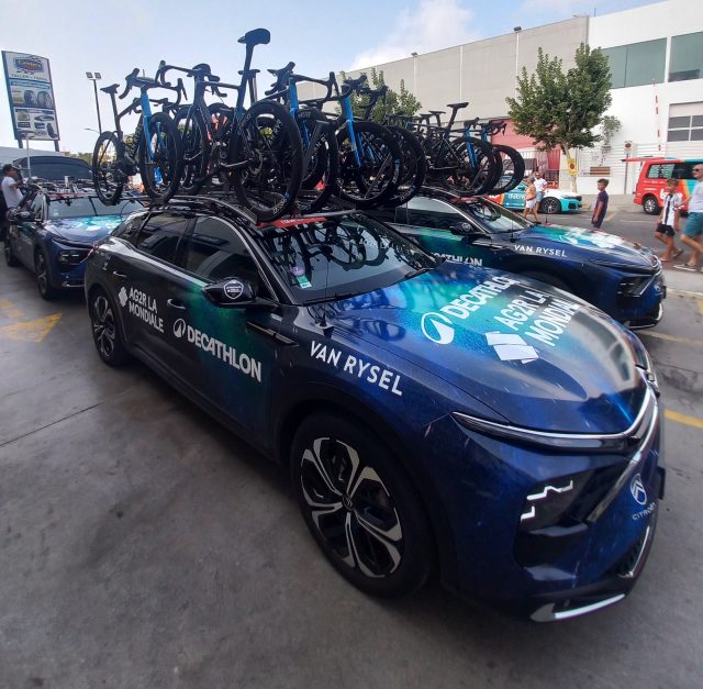 El francés forma parte de un equipo que, aparte de los 8 ciclistas que compiten, tiene un completo staff de 20 personas más. Cuatro mecánicos para poner las bicis a punto, de los cuales dos están en carrera y los otros dos se quedan en el hotel haciendo tareas que falten. Unos mecánicos que nos explicaron algunos secretos de sus bicicletas Van Rysel de Decathlon.