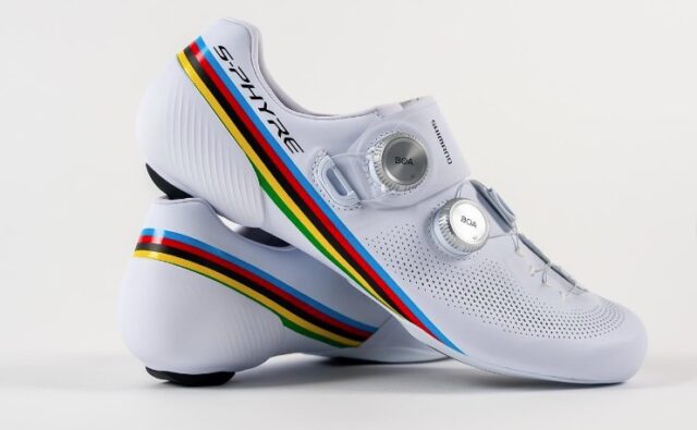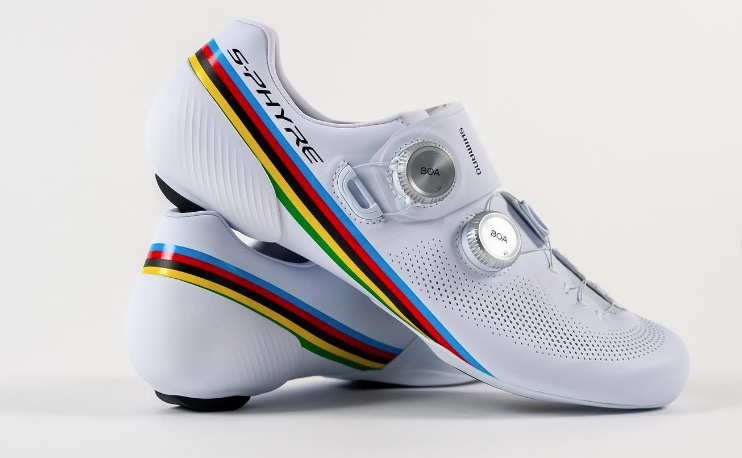 El modelo es el S-Phyre RC903 customizado con el arcoíris de campeón que también lucirá en el maillot. Más allá de esta franja arcoíris que recorre el lateral hasta la parte trasera, el resto de la zapatilla es igual, con todos los elementos que aseguran el máximo rendimiento y ajuste durante la carrera, como los clásicos y fantásticos cierres BOA metálicos.