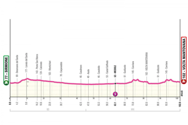 Los velocistas tendrán dos oportunidades para las volatas en el segundo día con final en Volta Mantovana (102 km) y la en la quinta etapa con final en Foligno con 111 km.
