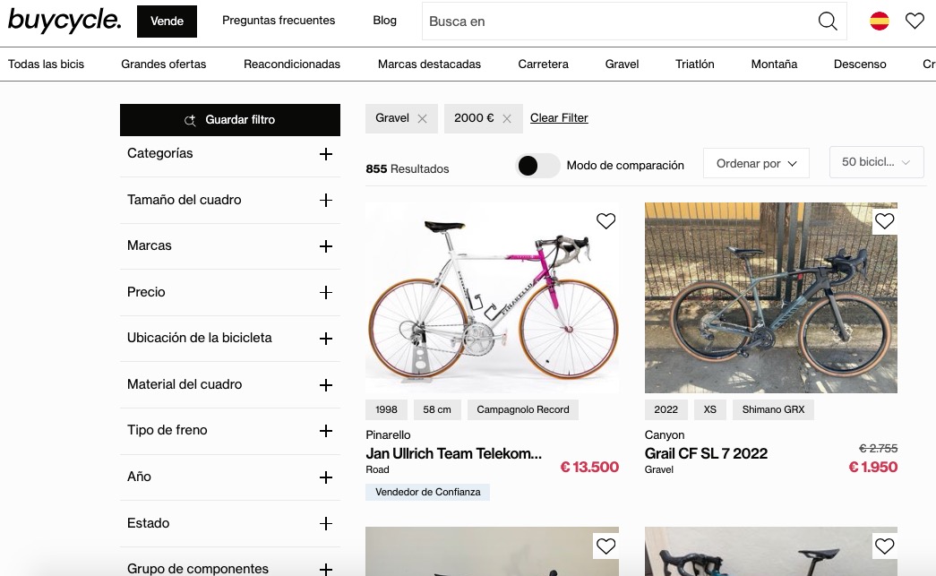 Puse en el buscador “gravel” y me aparecieron decenas de bicis de segunda mano que me parecían maravillosas, pero que se salían de mi presupuesto. Fue entonces cuando utilicé una de las grandes herramientas de webs como BuyCycle: sus filtros.