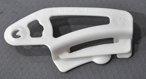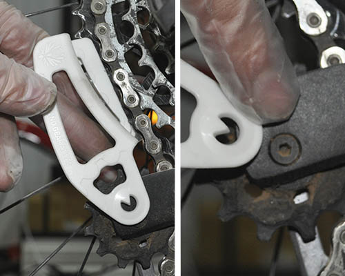 Con la última versión de esta herramienta, la blanca como hemos dicho, la cadena ha de estar en la segunda corona mas grande, y con todo en su posición, hacer coincidir la punta de la herramienta con el centro del tornillo de la roldana superior de nuestro cambio.