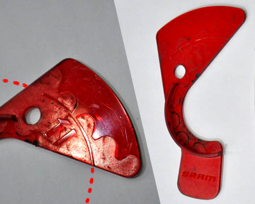 Con la cadena en la corona más grande y colocando dicha herramienta en su posición, veremos las marcas de las puntas de un corona en ella, para hacerlas coincidir con las puntas de la corona grande de nuestro cassette Sram Eagle.