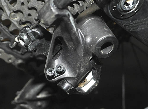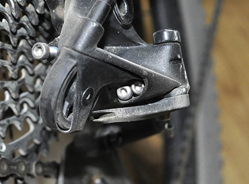 Otras muchas, o muchísimas veces, encontramos patillas de cambio (la parte del cuadro donde se atornilla el cambio) desviadas, ya sea por un golpe, caída, transporte, etc. El cambio de una bicicleta con la patilla del cuadro desviada cambiará, pero cambiará mal. Será necesario alinearla con la herramienta correspondiente para que el cambio vuelva a funcionar como debe.
