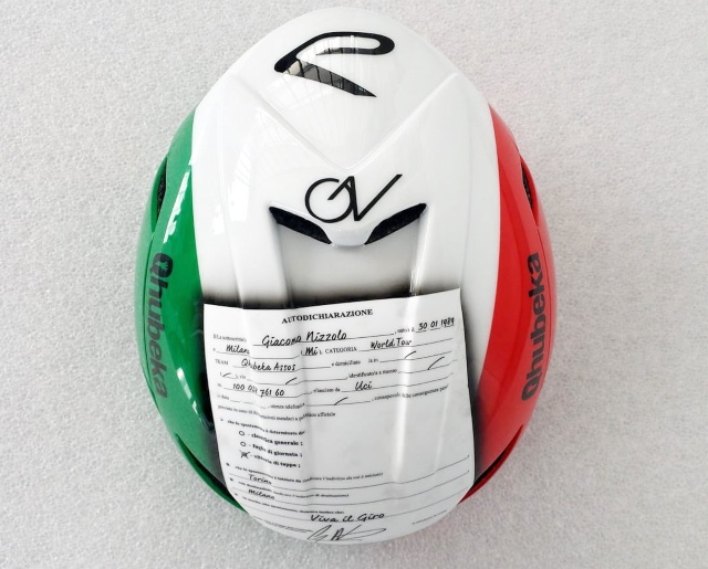 El corredor del equipo Qhubeka Assos, que está disputando la edición número 104 del Giro de Italia, ha decidido sacar a relucir los colores de la bandera italiana en su casco de la marca Ekoi – el maillot que lleva es el de campeón de Europa –, pero con un añadido muy particular: la bandera tricolor va acompañada de un documento que representa un permiso de movilidad Covid personalizado.