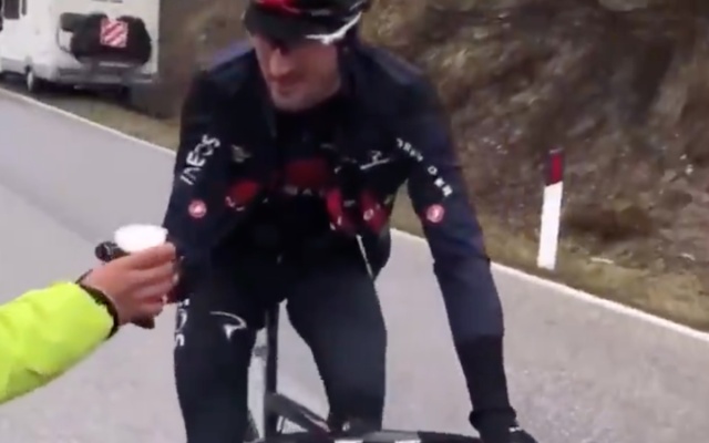 Este es el momento en que Gianni Moscon coge el vaso de unos aficionados.