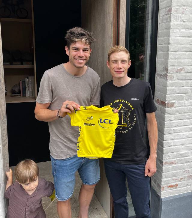 Una vez acabada la carrera francesa, Vingegaard voló de París a Bruselas a la casa de Van Aert para regalarle un maillot amarillo de talla pequeña para su hijo recién nacido.