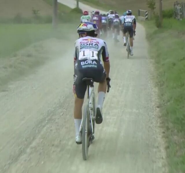 Sin duda, el ciclista que se ha llevado la peor parte del sterrato ha sido uno de los favoritos, Primoz Roglic. El esloveno sufrió primero una caída y después, un pinchazo que le alejaron de cabeza de carrera y el pelotón con los favoritos.