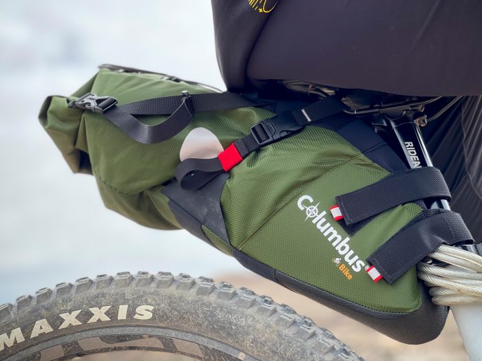 Su principal peculiaridad es que no va instalada en el portaequipajes de la bici, sino colgando desde el cuadro. Se agarra con velcros y, gracias a su diseño triangular, no molesta.