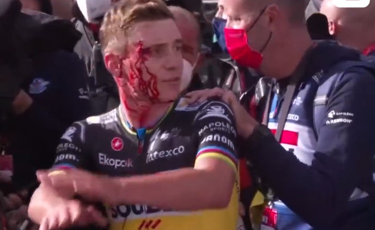 Tras cruzar la meta no logró detenerse a tiempo y colisionó con una mujer que se encontraba en la zona. Como resultado, tanto Remco como la mujer cayeron al suelo, resultando una evidente herida en la ceja derecha del ciclista.
