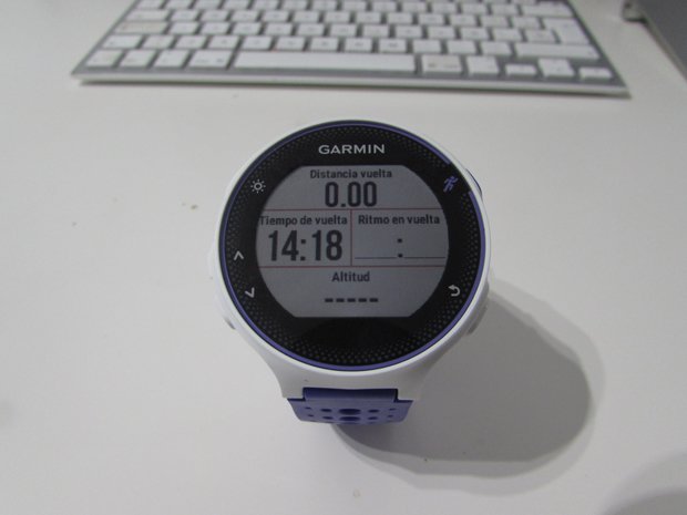 - Cadencia y cintas de correr: El acelerómetro interno, además de aportar el dato de cadencia de pasos, permite conocer el ritmo y la distancia corriendo en interiores o cintas de correr. Para activarlo tendremos que pulsar el botón UP (izquierda) en la pantalla de búsqueda de la señal gps.