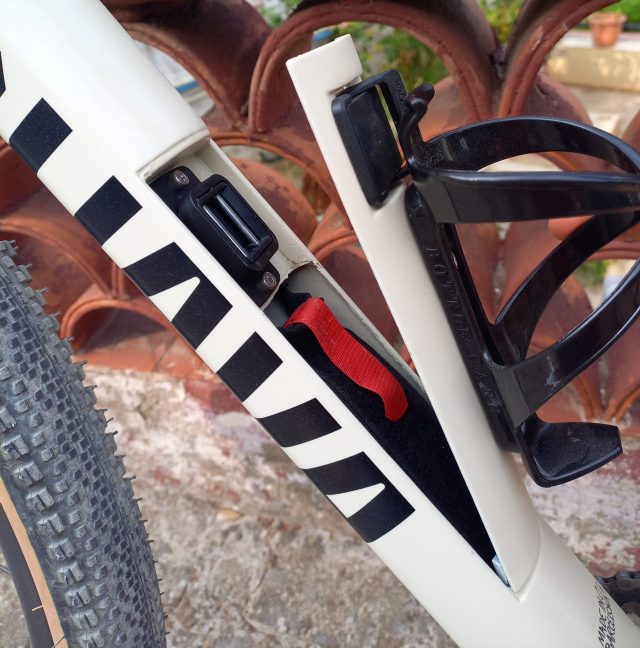 Una de las novedades de la bicicleta y de la marca es la incorporación de un orificio en forma de cápsula rectangular con un cierre magnético Fidlock. En él se pueden guardar bolsas o complementos de bikepacking. Este aspecto se diferencia de las otras bicicletas construidas con marcos de carbono.