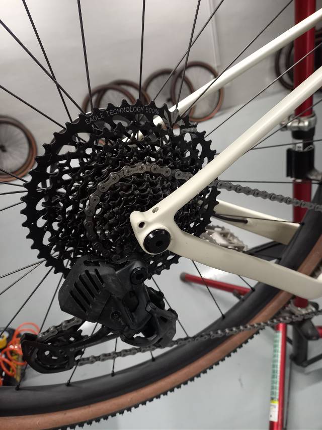 La bicicleta posee un sistema de cableado interno y protege los cables de cualquier elemento. El hecho de que los cables queden ocultos favorece que desde un punto visual la bicicleta tenga un aspecto totalmente limpio. La bicicleta tiene una transmisión de altas prestaciones con un grupo electrónico Sram Force Etap AXS monoplaro con cassette Eagle.