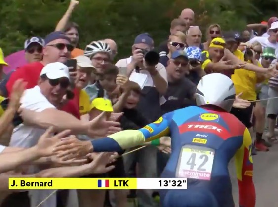 El pasado sábado se celebró la primera contrarreloj decisiva de las dos que se celebrarán en el Tour de Francia 2024 y que acabó ganando Remco Evenepoel. Sin embargo la imagen curiosa de la jornada la protagonizó Julien Bernard (Lidl-Trek). Arropado por sus familiares y amigos llegó a pararse para besar a su mujer y su hijo que le esperaban en un punto intermedio de la etapa.