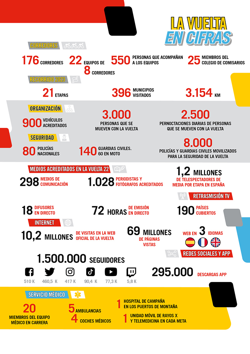 La Vuelta a España 2023 se presenta como una de las más espectaculares de los últimos años, ya sea por su recorrido donde predomina la dureza (4 etapas llanas, 2 llanas con llegada en ascenso, 6 de media montaña, 7 de alta montaña y 2 contrarrelojes) por su participación de lujo (se podrá disfrutar del duelo entre Primoz Roglic y Remco Evenepoel) como por los números que ha presentado su organización, en los que incluyen datos que visualizan la magnitud de un evento móvil de tales características que durante tres semanas cruza toda España sin apenas respiro.