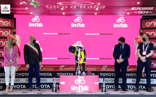 Este martes le ha tocado recibir a Biniam Girmay (Intermarché-Wanty-Gobert Matériaux), pero el otro día fue Mathieu Van der Poel (Alpecin-Fenix). Y es que los corchos de las botellas de champán del podio del Giro de Italia 2022 están jugando una mala pasada a algunos de los corredores.