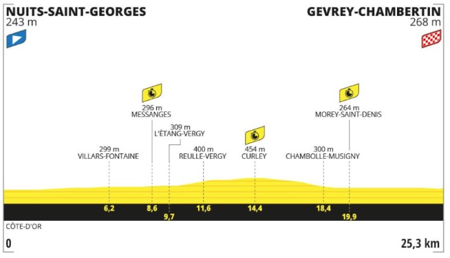 En esta primera etapa contrarreloj que se disputará entre Nuits-Saint-Georges y Gevrey-Chambertin se suben 303 metros de desnivel positivo debido principalmente a un pequeño alto, la Côte de Curley, que se encuentra a mitad de la prueba. Probablemente sea una prueba muy rápida, pues los corredores todavía estarán en la primera semana de competición y estarán “frescos”.