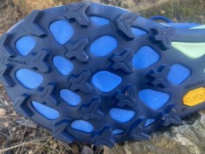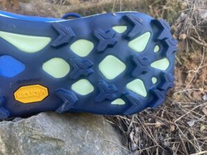 El comportamiento en terreno técnico es uno de los aspectos más valorados del modelo. En pruebas sobre superficies mixtas, desde roca volcánica hasta zonas de barro profundo, la zapatilla demuestra una excelente capacidad de agarre gracias a la suela Vibram Megagrip. Pero la verdadera evolución está en los Traction Lugs, unas microprotuberancias que se suman al taqueado principal y que mejoran la tracción en fases de impulsión y frenada.
