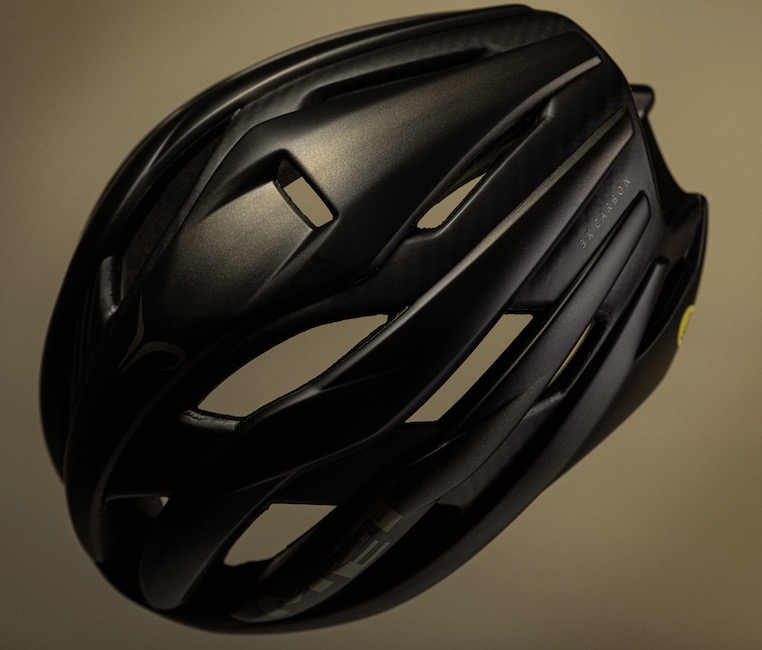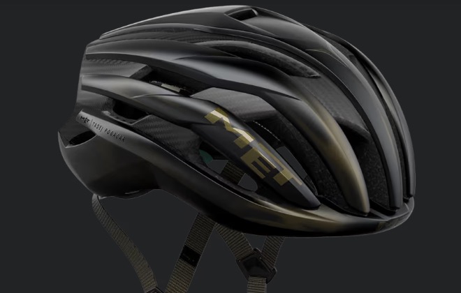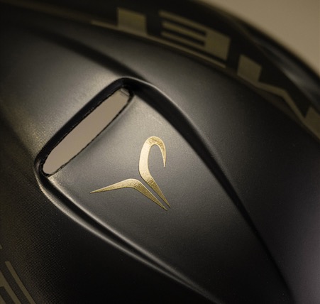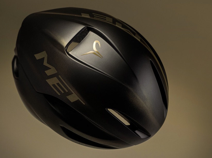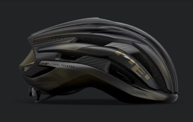El casco, en el que destacan las vetas doradas, tiene un diseño aerodinámico y detalles relacionados con el campeón esloveno. Fabricado con la tecnología de carbono 3K, está creado con una jaula de fibra de carbono integrada para mejorar el rendimiento de la carcasa de policarbonato en molde con revestimiento de EPS.