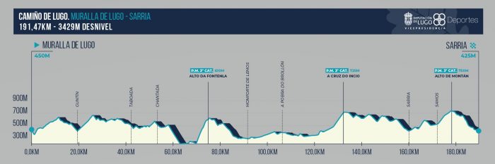 La primera etapa recorrerá la provincia de Lugo, con arranque sobre la propia muralla romana de la capital y final en Sarria, punto emblemático de paso del Camino Francés. Serán 191 kilómetros con 3.429 metros de desnivel acumulado y una ruta por el sur de la provincia que afrontará tres altos de tercera categoría: el Alto da Fontenla, A Cruz do Incio y el Alto de Montán.