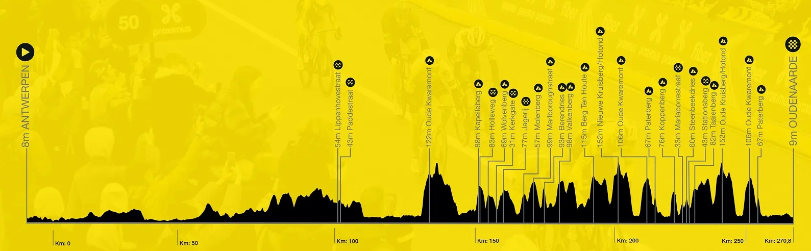 Empecemos por el Oude Kwaremont. Apenas tiene 106 metros de altura pero siempre es decisivo. Es un estrecho camino que en sus poco más de 2 kilómetros (2.200 metros exactamente) suele abarrotarse de gente dispuesta a ver cómo los ciclistas sufren sobre su adoquinado.