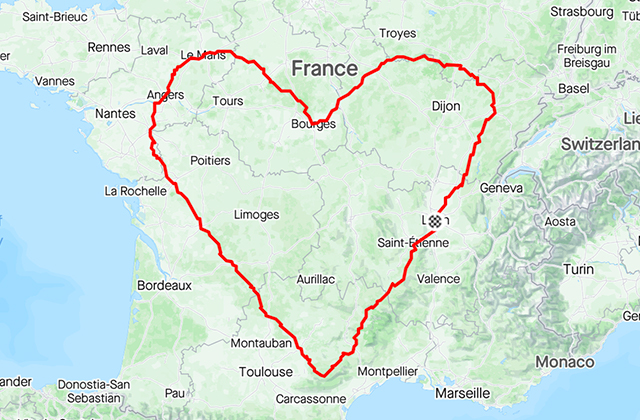 2.172 kilómetros recorridos en bicicleta (con 26K de desnivel) por las carreteras francesas formando un dibujo de un enorme corazón. Este es el nuevo récord Guiness del dibujo GPS en bicicleta jamás creado, ¡y además pedaleando sobre un tándem!