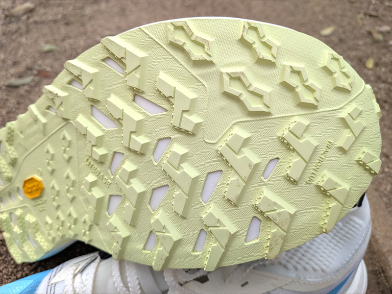 La suela también incorpora Vibram Litebase para ayudar a aligerar la suela, reduciendo el grosor y el peso de la suela de goma sin sacrificar el rendimiento