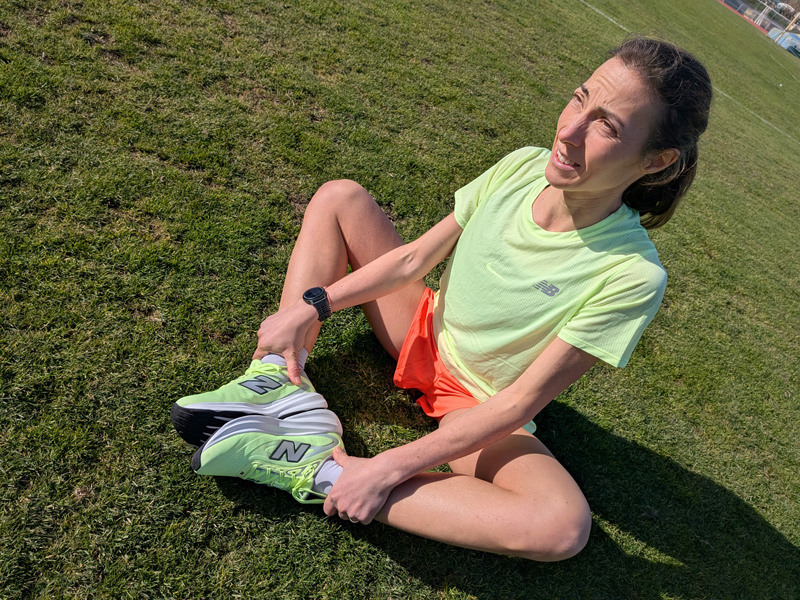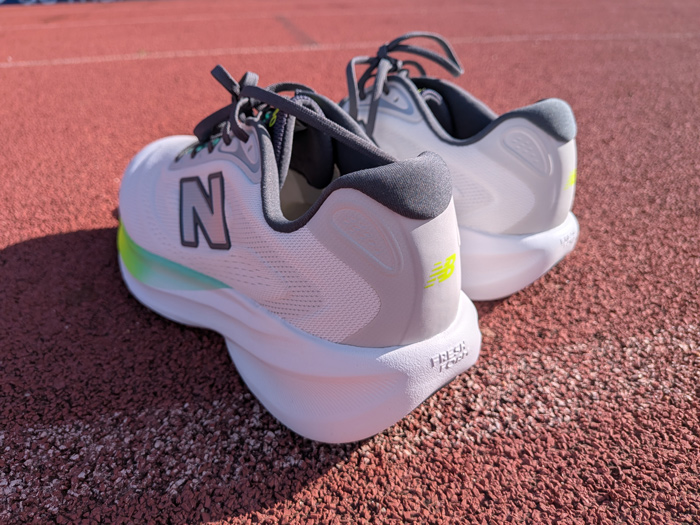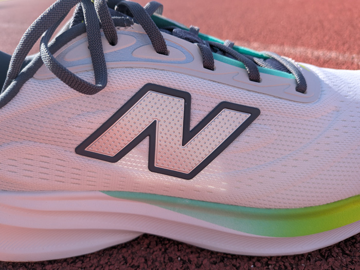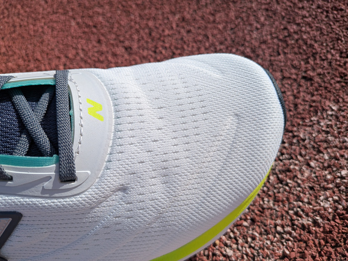 La gran “N” es el logo que visualiza la marca New Balance, pero casi siempre tiene pluriempleo, ya que normalmente se aprovecha para aportar estructura a esta parte de la malla, que es muy sufrida por las tensiones del pie en movimiento. Además, esta vez nos sirve como reflectante para cuando salimos a correr cuando ya ha oscurecido.