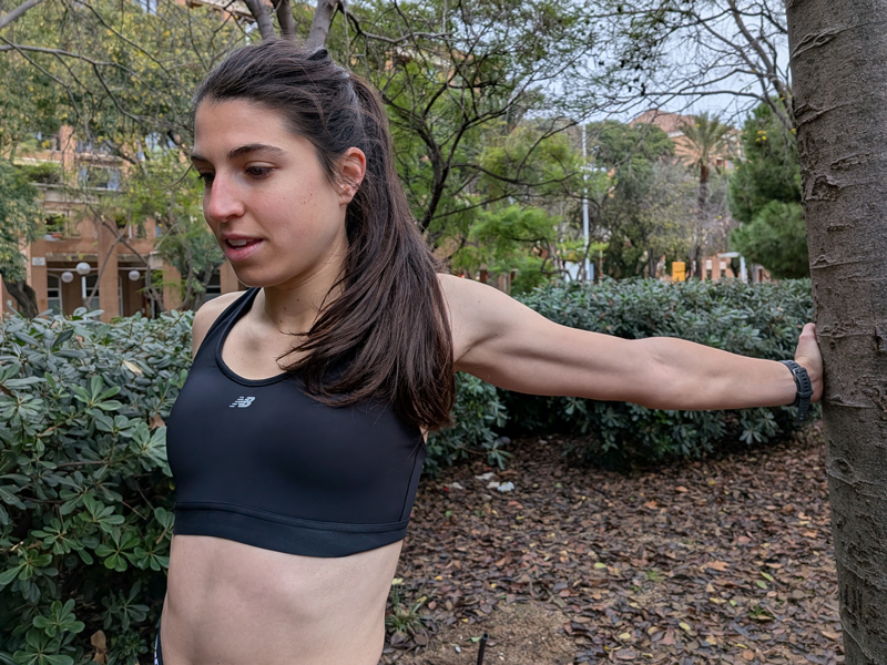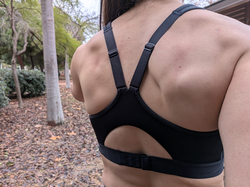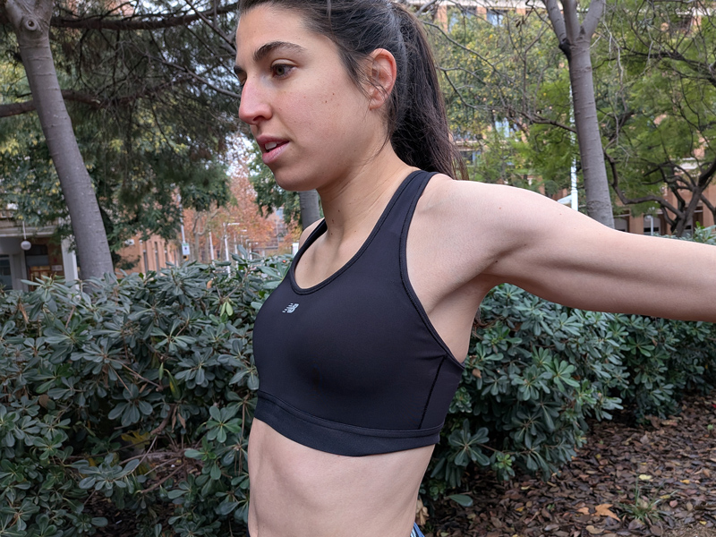En cambios de ritmo o cuestas por ejemplo, se aprecia cómo las copas preformadas y la banda inferior ajustable reparten el soporte: la sujeción viene, como debe, del contorno torácico; los tirantes regulables solo rematan la altura y amortiguan el movimiento vertical.