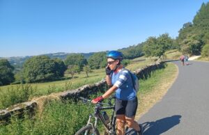 Algo tan simple como lo que está haciendo esta mujer de la foto en el Camino de Santiago (bajarse de la bici para hablar...