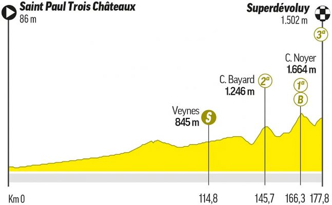Tras un primer test exigente en la etapa 2 con la subidda a la Madona di San Luca, el primer día de alta montaña será en la cuarta etapa, en donde se ascenderán hasta los 2.642 metros de desnivel. Una jornada en Maurienne con tres picos míticos del ciclismo: Sestriere, Monginevro y el Col du Galiber.