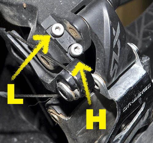 Para que nos entendamos, las cotas son los límites a lo que deberá llegar el desviador de platos tanto en el plato pequeño como en el grande. Suelen estar marcados con una H (plato grande o High) y una L (plato pequeño o Low).