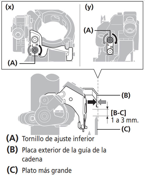 - Debemos ajustar los tornillos de cota como ya hemos visto, para que la cadena quede en su lugar correspondiente tanto en plato grande como plato pequeño, sin roces y sin salidas de cadena.