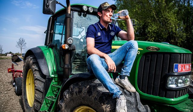 Yves Lampaert, posando junto a su tractor. Foto: Quick Step Team