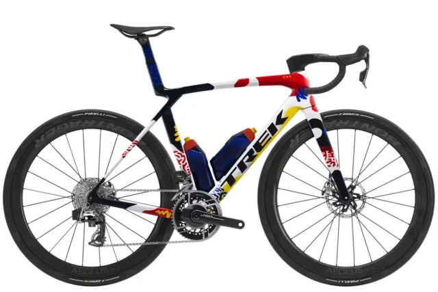 Las ruedas Bontrager Aeolus RSL, de perfil alto y construcción en carbono, completan un montaje de competición pura. Incluso los portabidones han sido optimizados para integrarse en el flujo aerodinámico del cuadro, confirmando la obsesión por cada detalle.