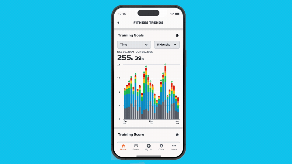 Al pulsar sobre los bloques de Objetivos y Seguimiento de Forma en la pantalla de inicio de Zwift Companion, los Zwifters accederán a una serie de gráficos que mostrarán sus objetivos de entrenamiento, la racha de Zwift (Zwift Streak), el estado de entrenamiento histórico y su puntuación histórica de entrenamiento.